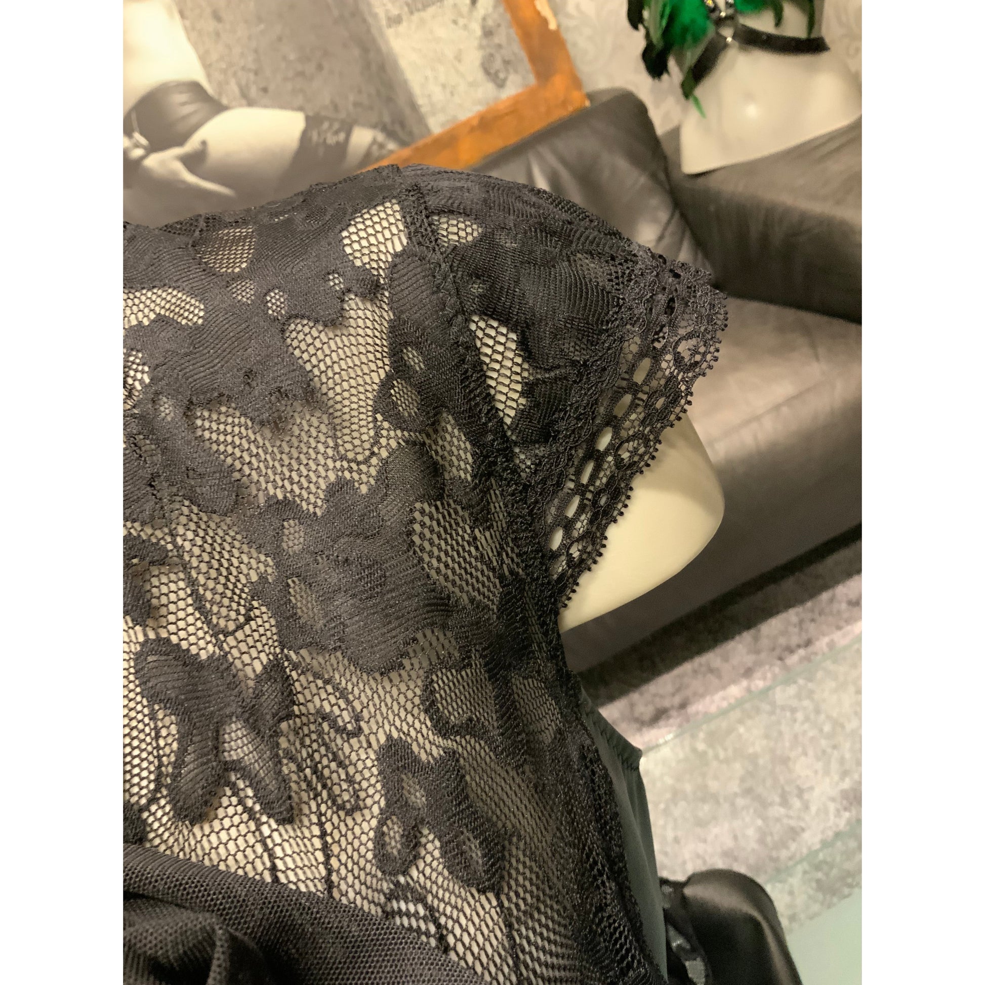 Handgenähte Bluse von Lee Kleimann. Schwarze Spitze kombiniert mit feinem Kunstleder seitlich und einer feinen Tüllschleife. Die Bluse hat angesetzte kuze Ärmel und hinten eine durchgehenden Reißverschluss. ACHTUNG! Fällt größer aus.