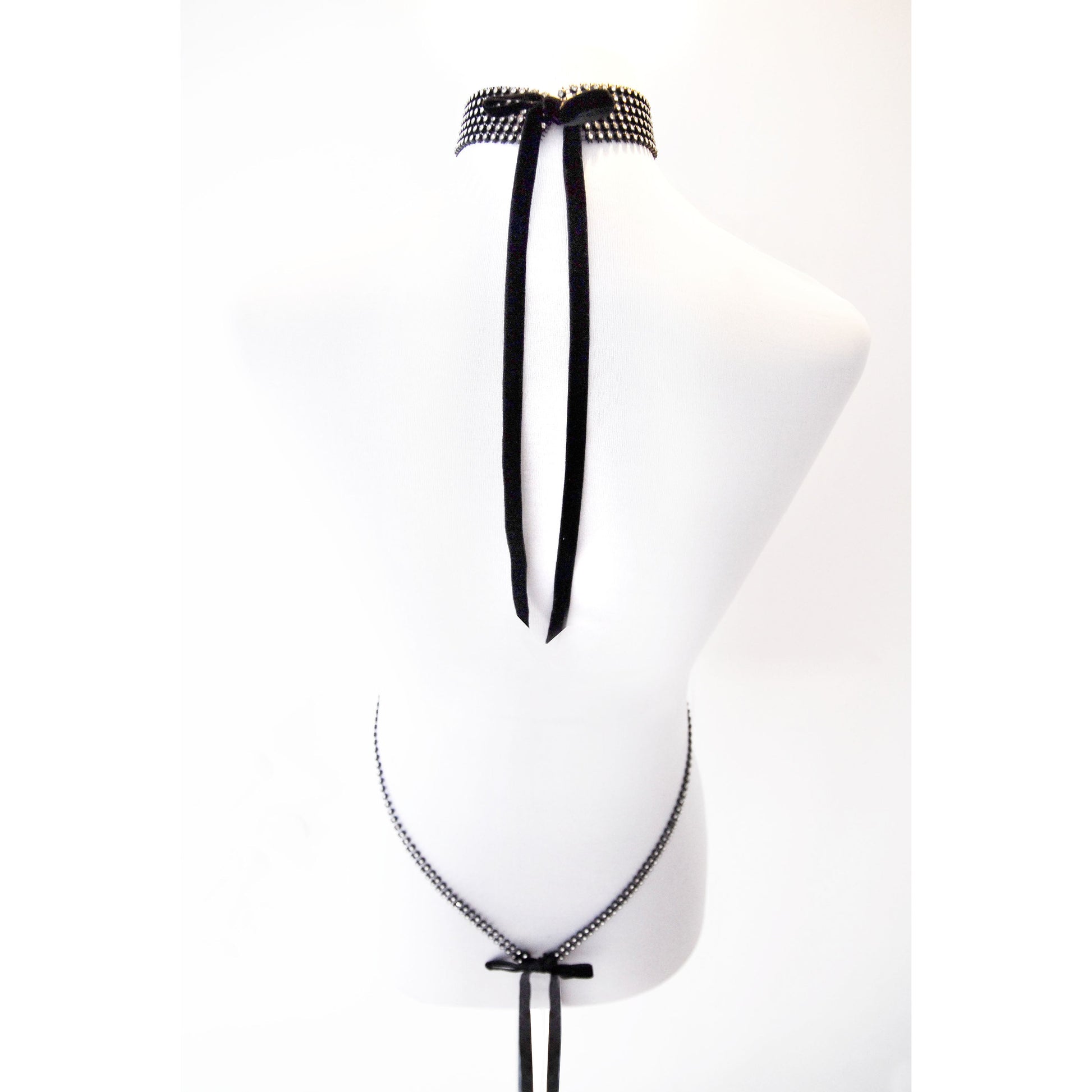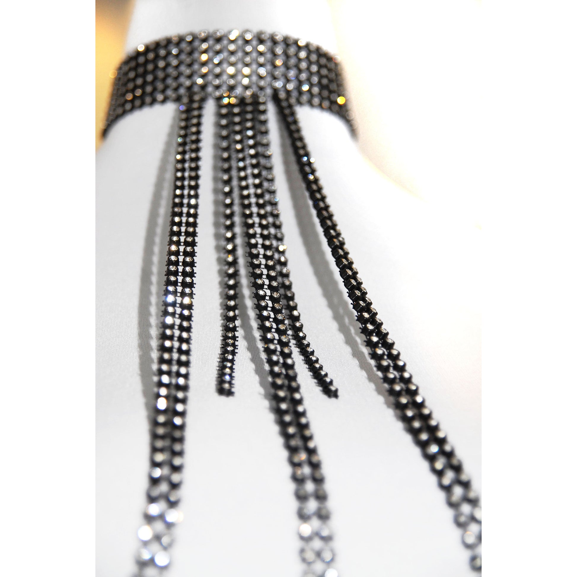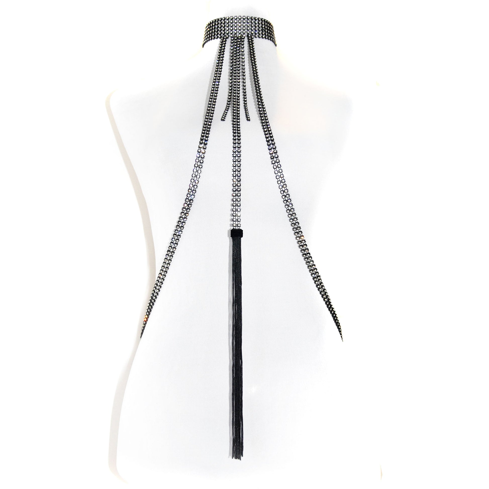 Körperschmuck aus Acrylglassteinen auf einem beweglichen Gitter und Fransenquaste. Geschlossen wird der Schmuck mit schmale, weichen Samtbändern
