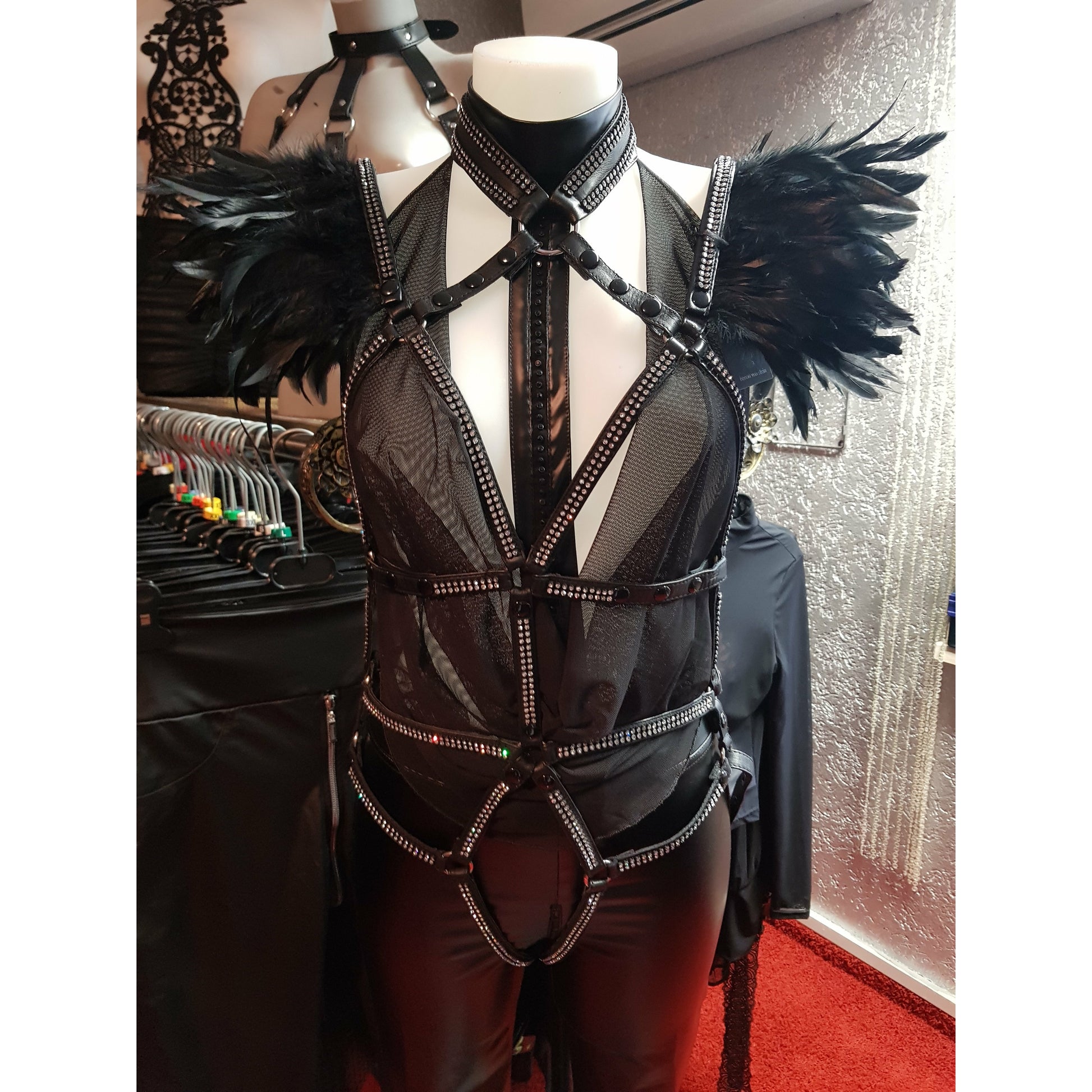 Ein Harness mit funkelnden Steinen. Dank der Druckknöpfe in vielen Variationen tragbar.Als Körperharness mit Beinstück, als Körperharness wie auf dem Foto mit Rock zu sehen.Oder aber nur als Brustharness.