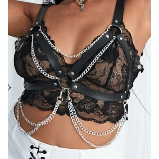 Ein toller Kunstleder Harness / BH mit Ketten, Ringen und Schnallen. Sexy über dem BH, dem Kleid oder auf nackter Haut getragen