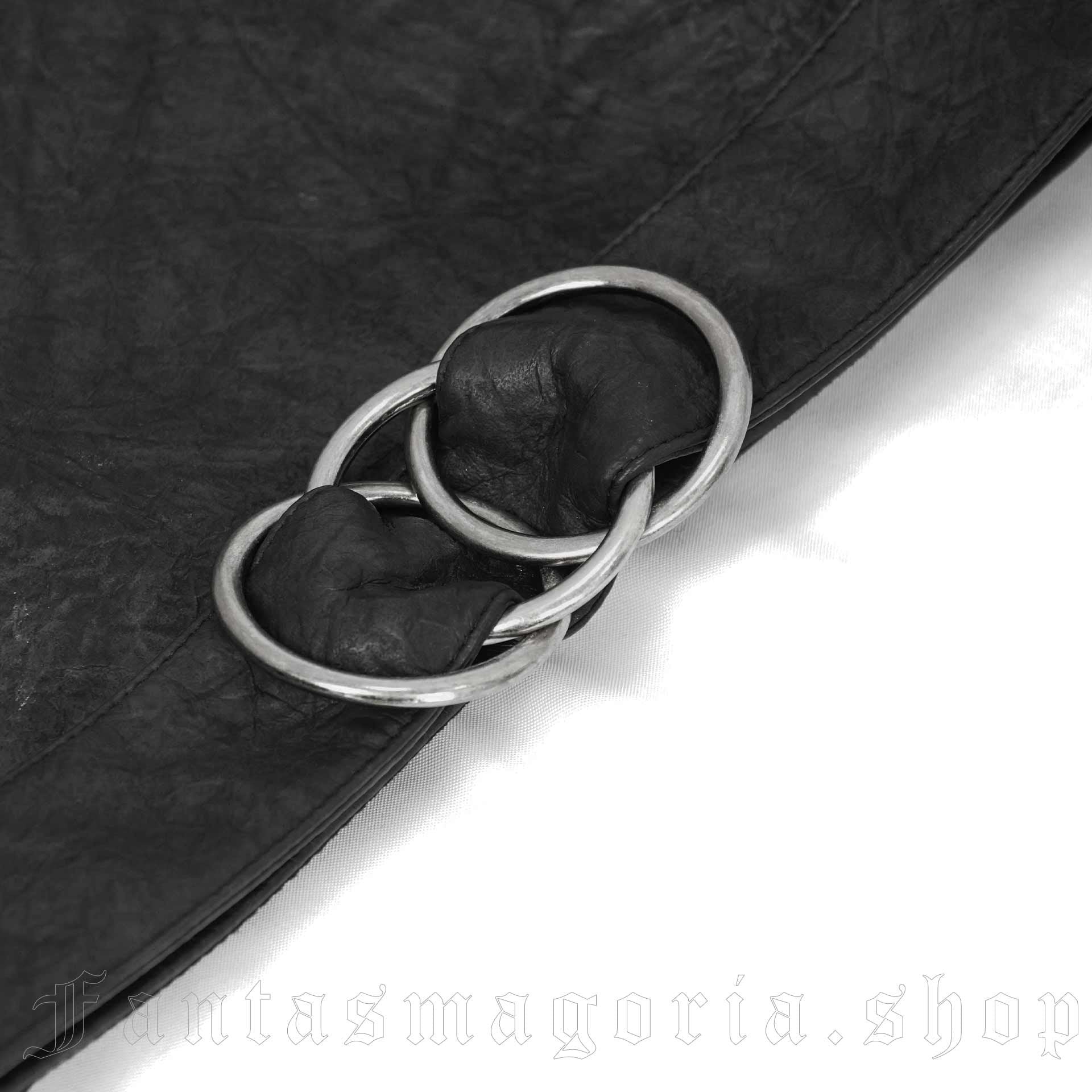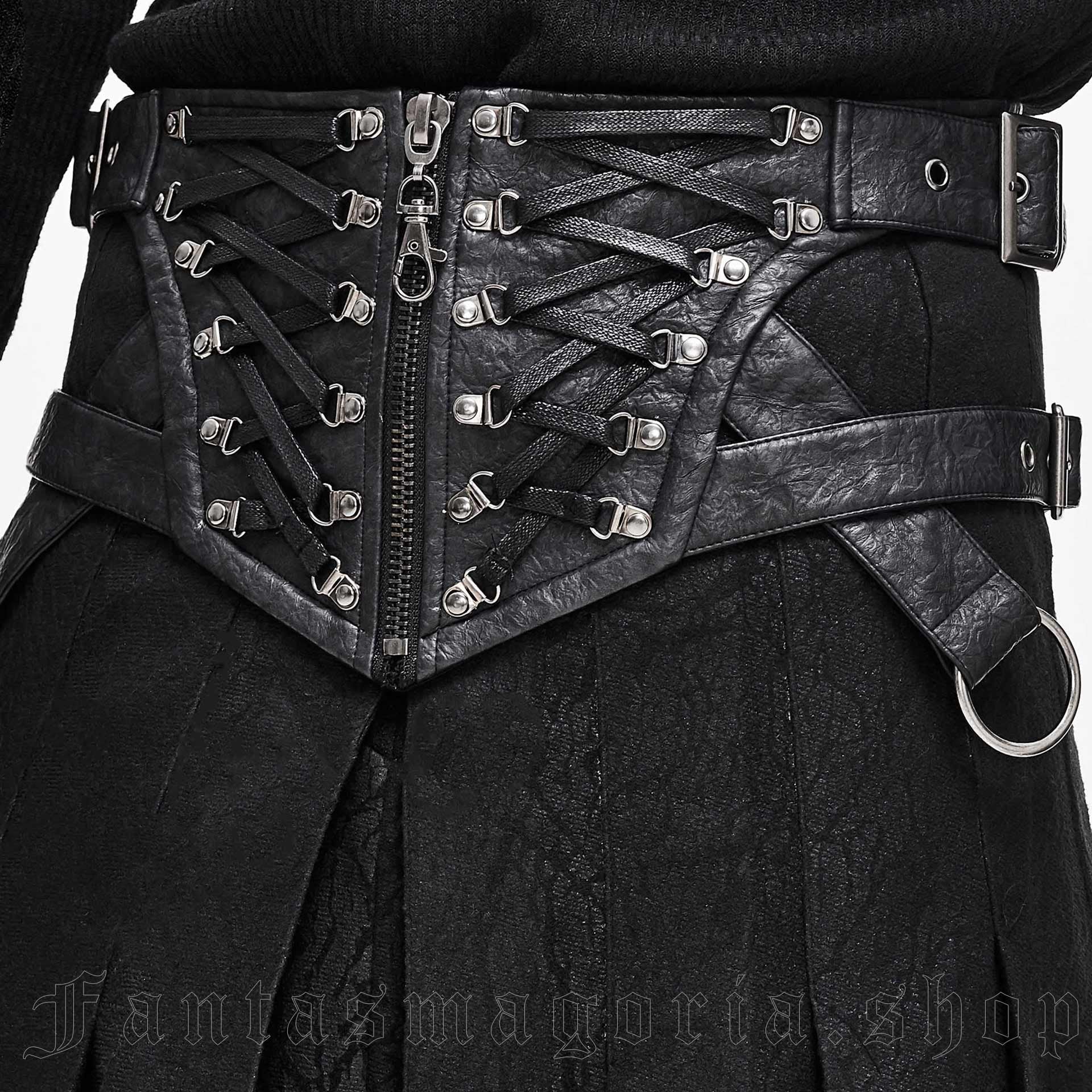 Ein Rock aus mittelschwerem gemustertem Stoff, der aussieht wie ein Kilt in typischer Faltung wie marmoriertes Leder. Der obere Taillen-Sattel ist aus geknautschtem Kunstleder (nicht elastisch), toll verarbeitet. Vorne mit Zipper und einer Zierschnürung. Des weiteren sehr viele Details aus Bändern, Schnallen und Ösen.