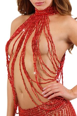 Körperschmuck aus roten Perlen mit orsgen Reflexionen am Halsteil. Geschlossen wird der Schmuck im Nacken mit einem Klettverschluss. Das Halsteil ist ca. 5 cm hoch