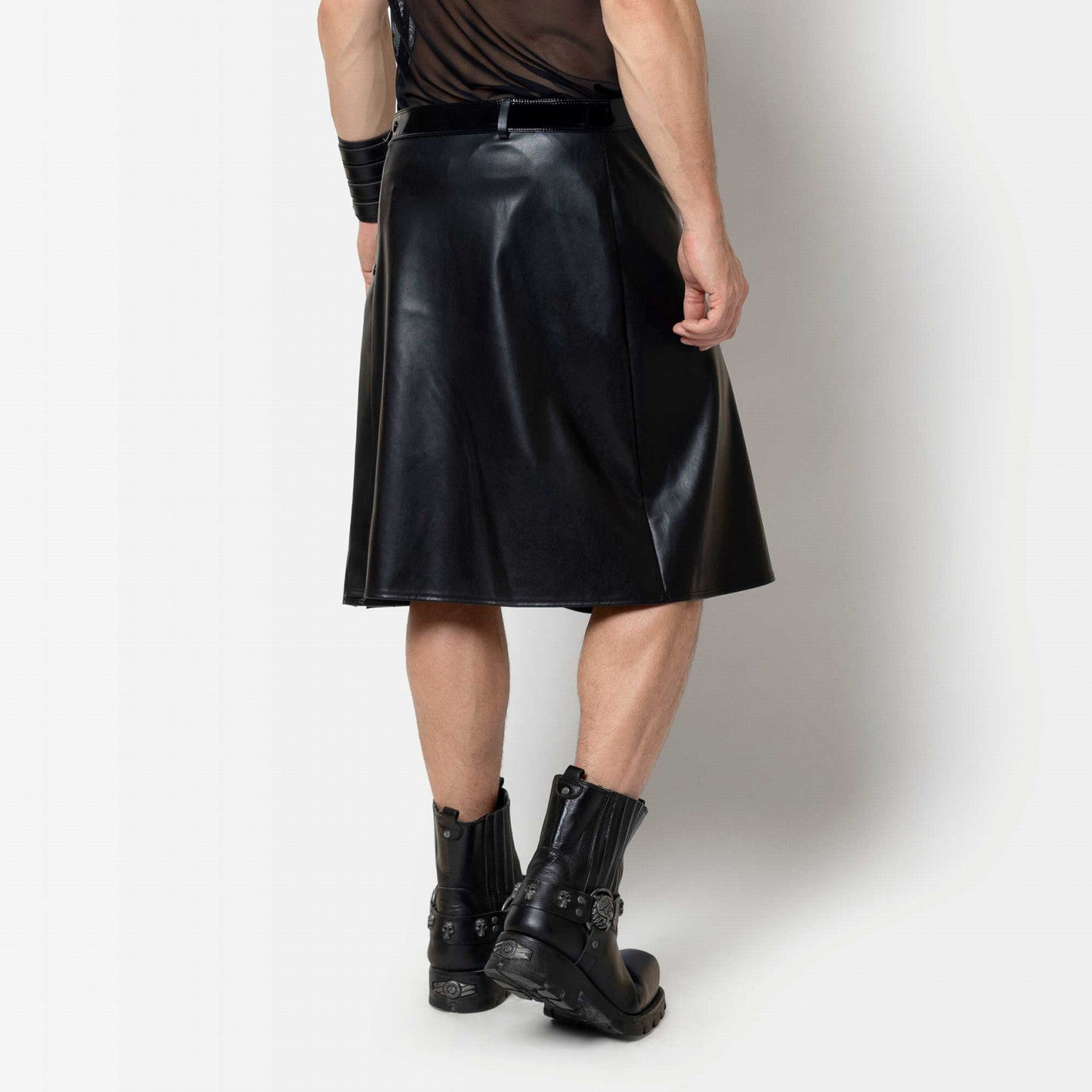 Endlich wieder ein toller Herren Kilt. Designt aus schwarzem Kunstleder mit einem gefalteten Einsatz aus glänzendem Lack. Dieser Einsatz ist eingenöpft und kann durch den ebenfalls im Shop erhältlichen Rot/schwarzen Baumwoll-Einsatz ersetzt werden. Der Rock hat Gürtelschlaufen.
