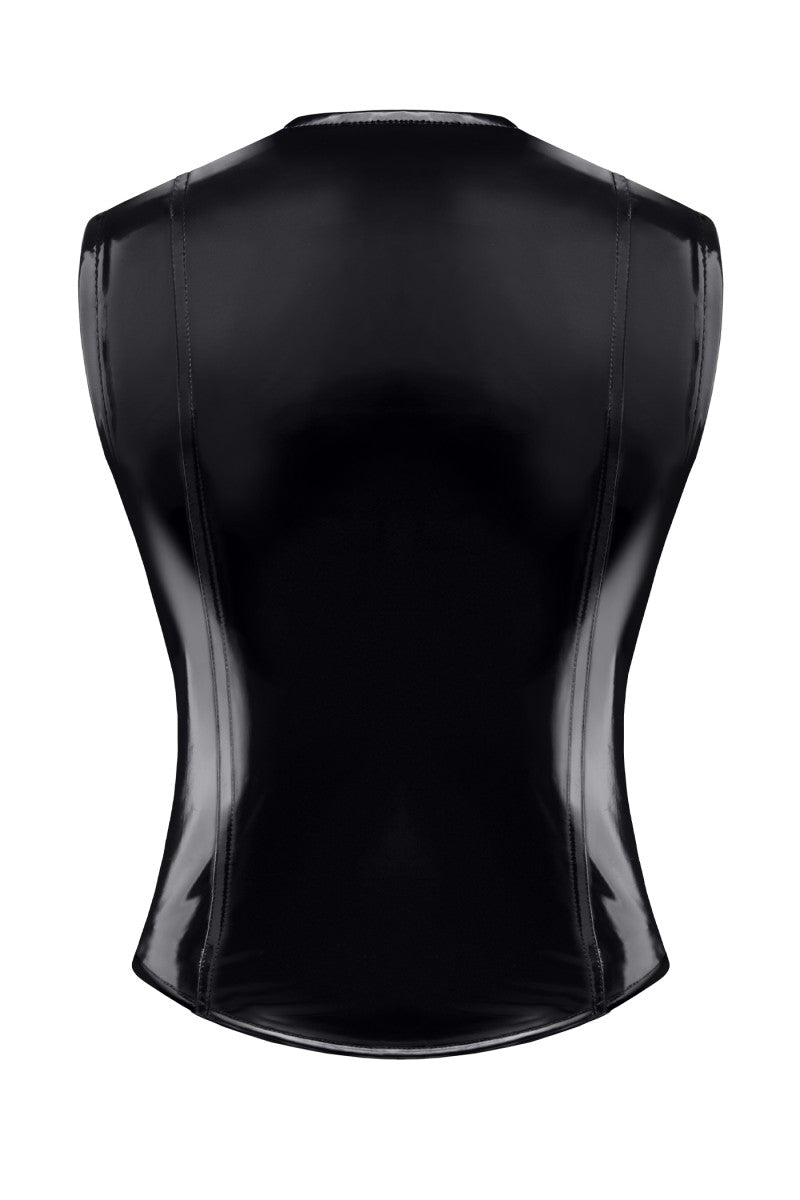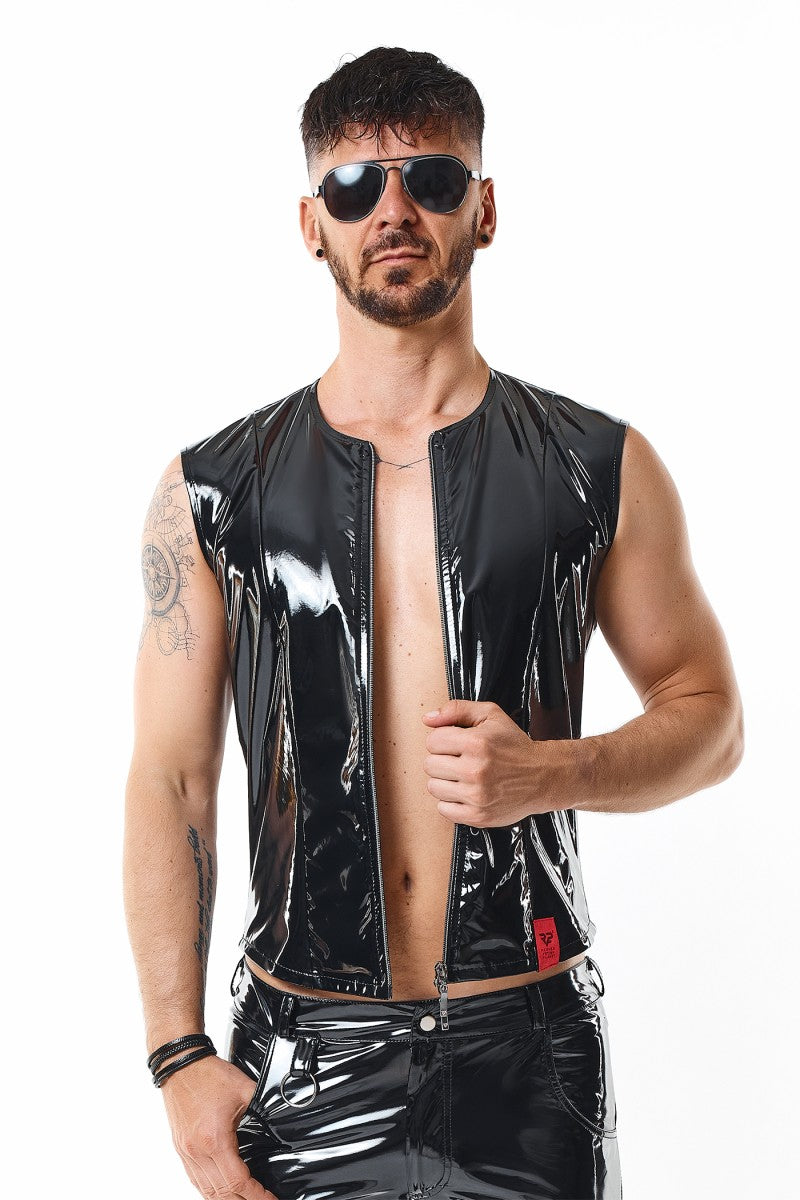 Einzigartige, moderne Weste aus schwarzem, elastischem PVC. Vorne befindet sich ein dunkler 2-Wege-Reißverschluss, der sich sowohl von oben als auch von unten öffnen lässt. Die Reißverschlüsse sind mit dem Logo von RFP Regnes Fetish Planet eingraviert. Auf der Vorder- und Rückseite befinden sich vertikale Nähte, die für einen einzigartigen Look sorgen und gleichzeitig die Taille optisch verschlanken und die Schulter- und Brustlinie verbreitern, wodurch eine muskellösere Silhouette entsteht.