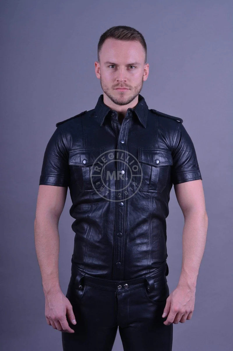 Dieses taillierte Hemd aus schwarzem Leder hat kurze Ärmel, schwarze Knöpfe, Schulterklappen und zwei Brusttaschen. Dieses Hemd ist etwas länger (3 cm) als andere klassische Hemden.
