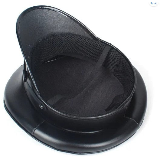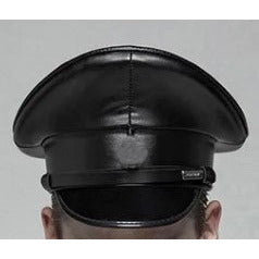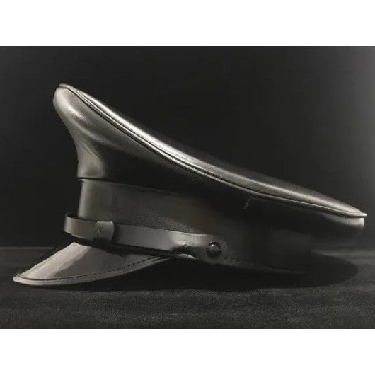 Unisex Schirmmütze MILITARY aus schwarzem Kunstleder mit Lackschirm und Band. Dieser Hut hat ein Gummiband, entweder damit er besser hält, oder aber wenn erstört zum abhängen auf dem Rücken.